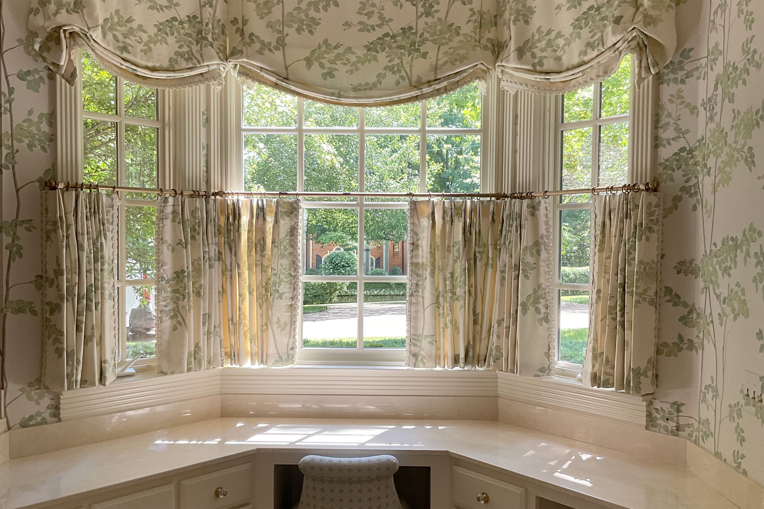 One of our favorite approaches is to create envelope rooms - spaces where walls and windows work together through coordinated materials. This might mean using the same stunning print for both the wallpaper and the drapery, or selecting complementary designs to create intentional harmony.