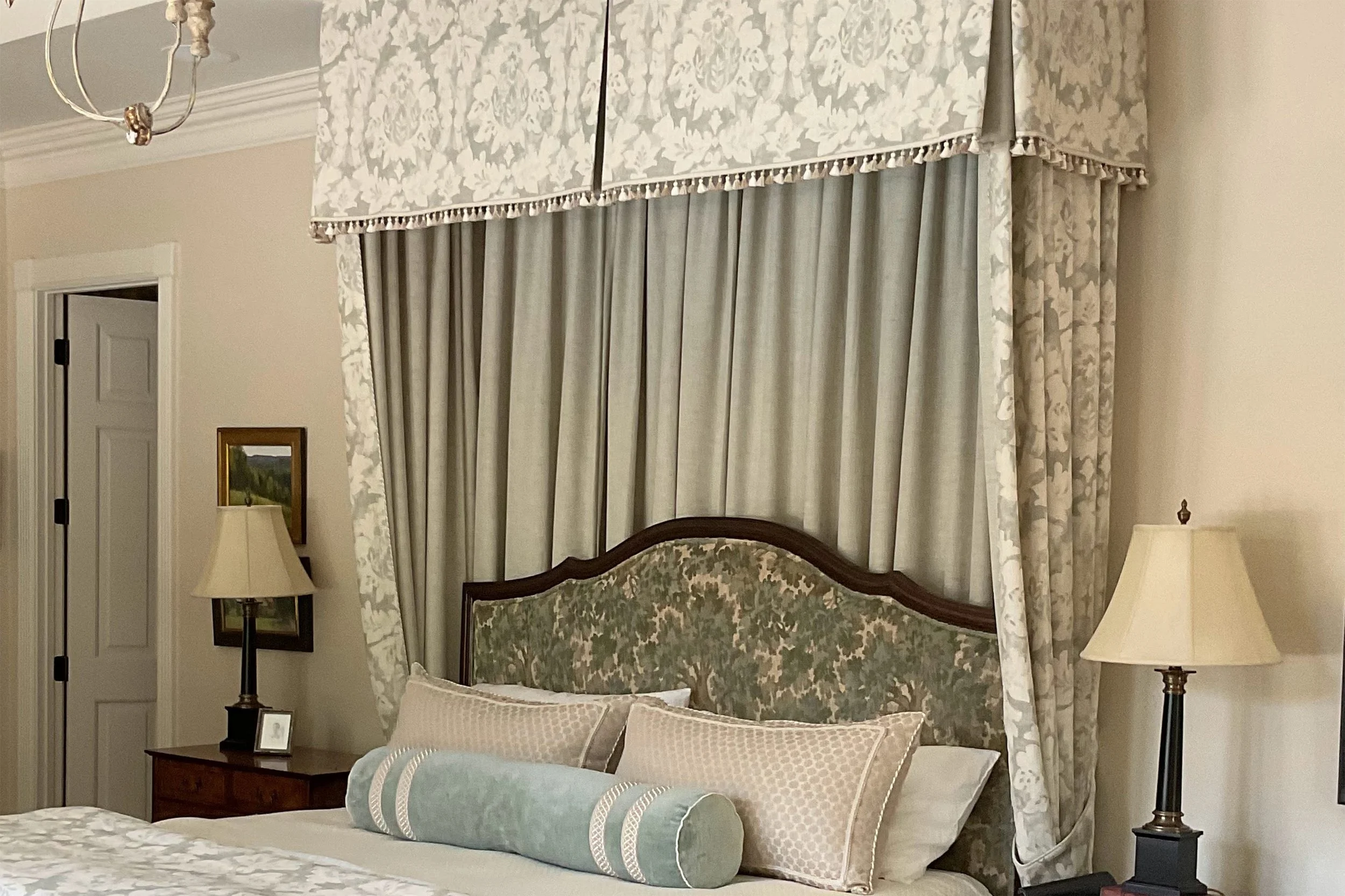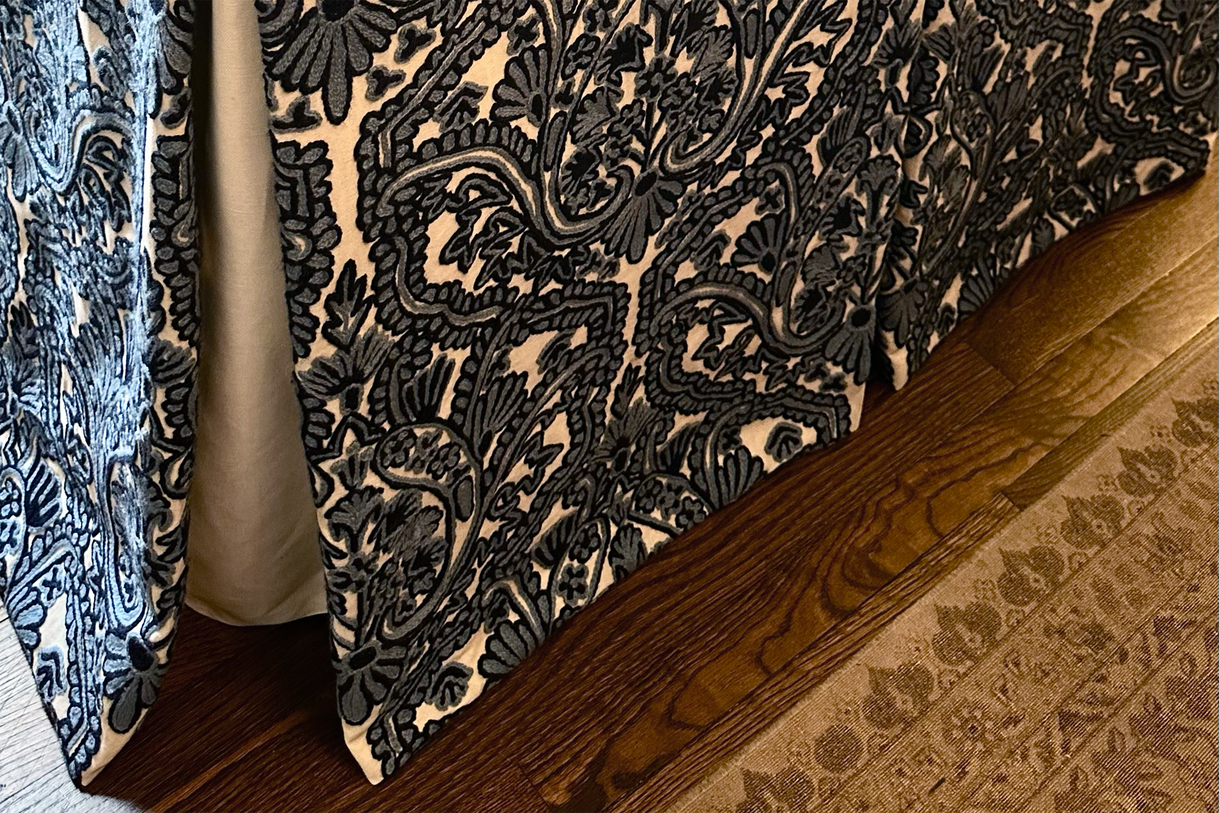 Statement drapery is where chintz truly shines. Floor-to-ceiling custom window treatments in glazed florals create instant drama and sophistication. The scale allows the patterns to read properly while the glaze helps them hold their own against contemporary furnishings. We often recommend chintz drapery as a room's primary pattern, then build around it with solid or subtly textured pieces.